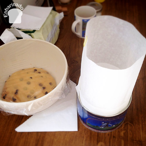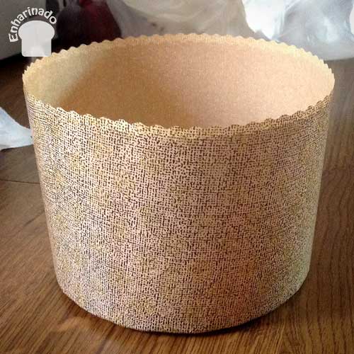• 1 cápsula de papel para panettone de 500 gr. (Como donde vivimos es difícil conseguir estas cápsulas, nosotros utilizamos una lata de galletas de 14 cm. de diámetro y 9 cm. de alto. Le dimos altura utilizando papel antiadherente para hornos como te enseñamos en la fotografía)